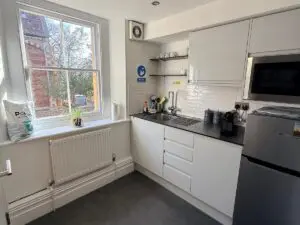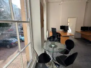 The property is located on the ground floor and provides a light and airy office currently set up as 5 desks. There is also a shared kitchenette, bookable board room with balcony and shower facilities.