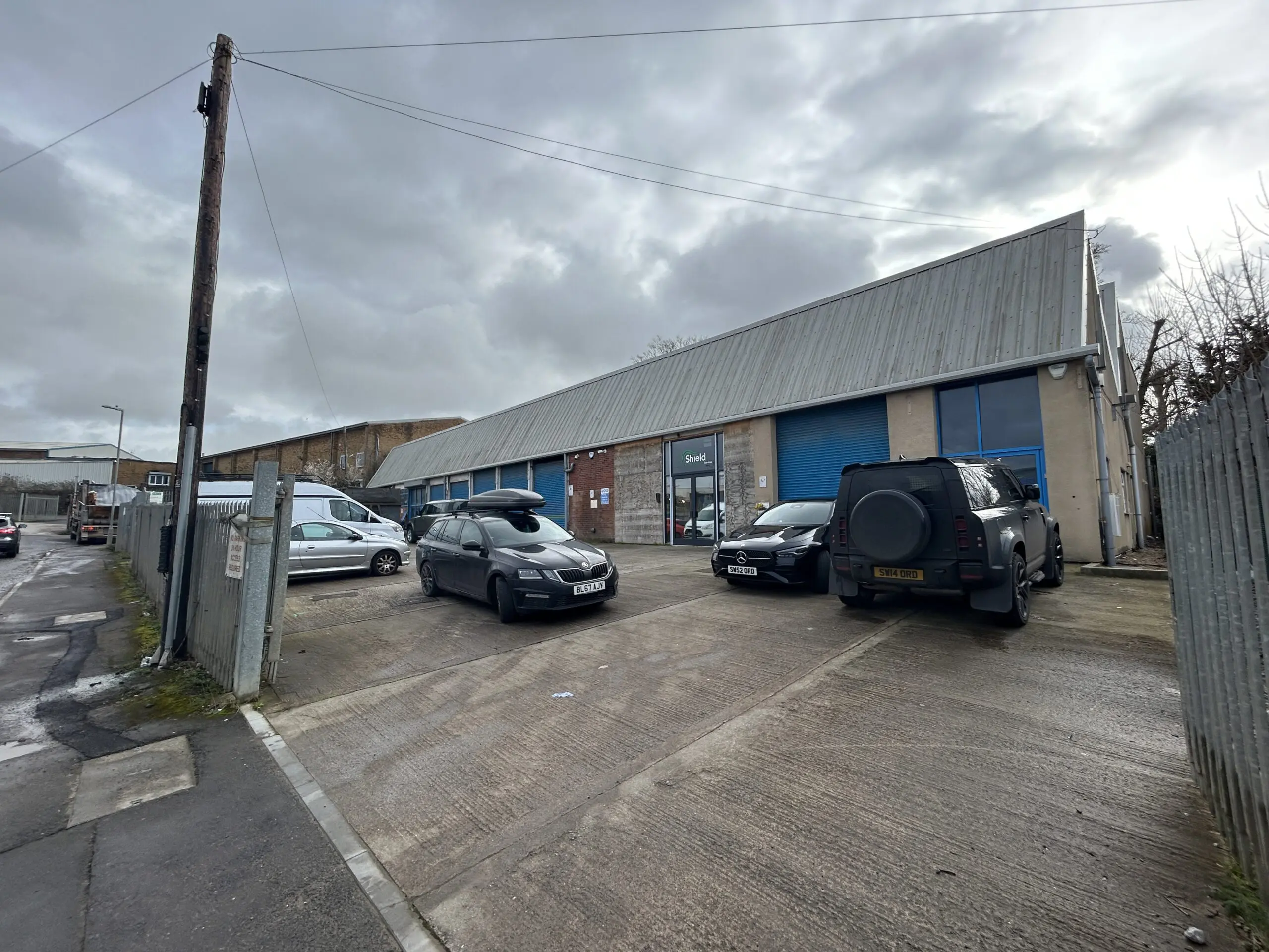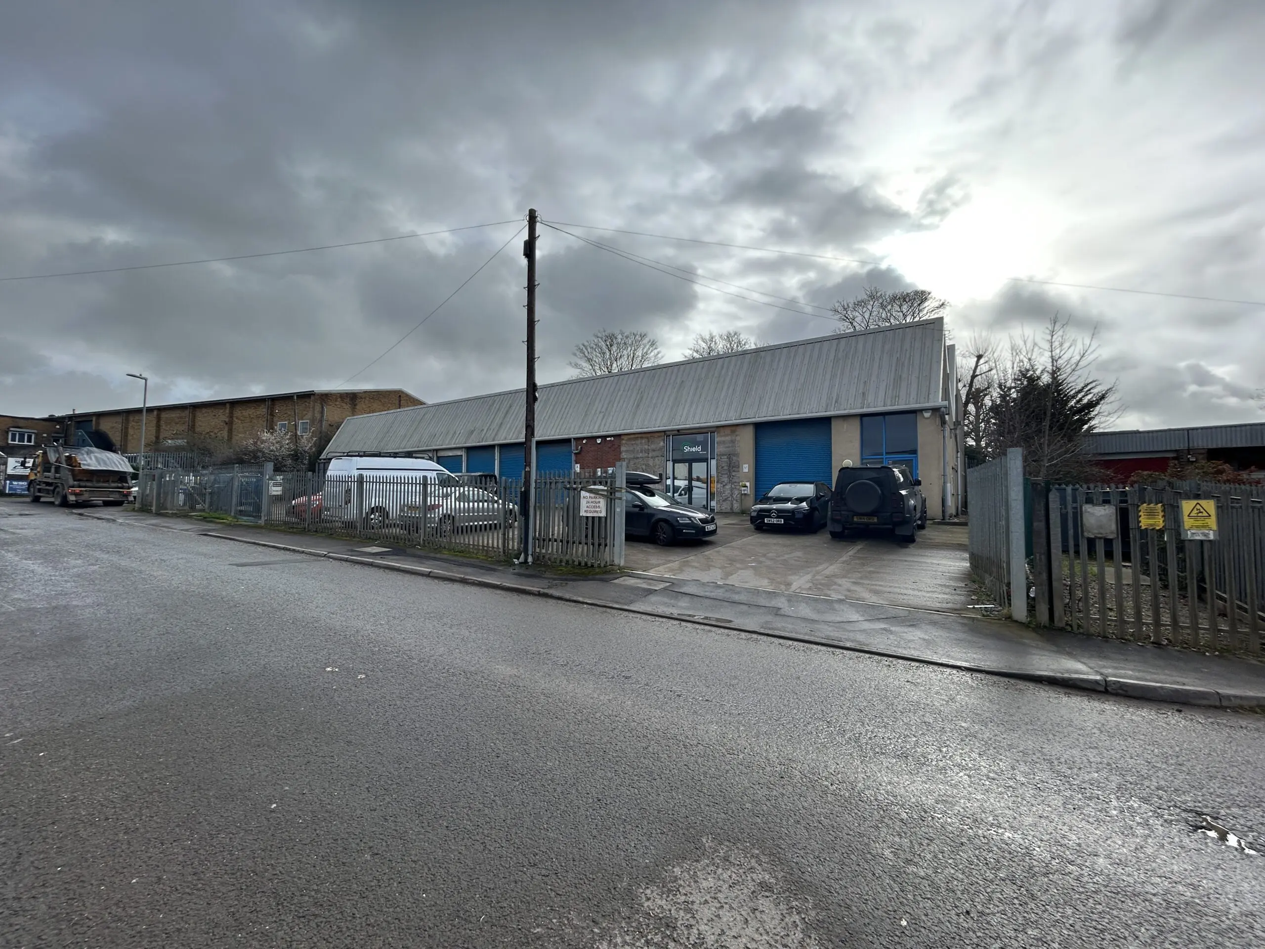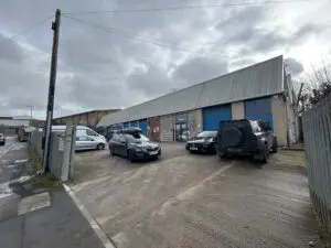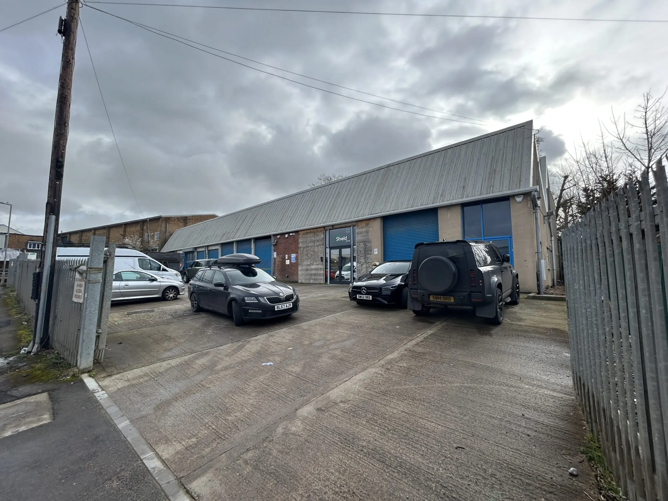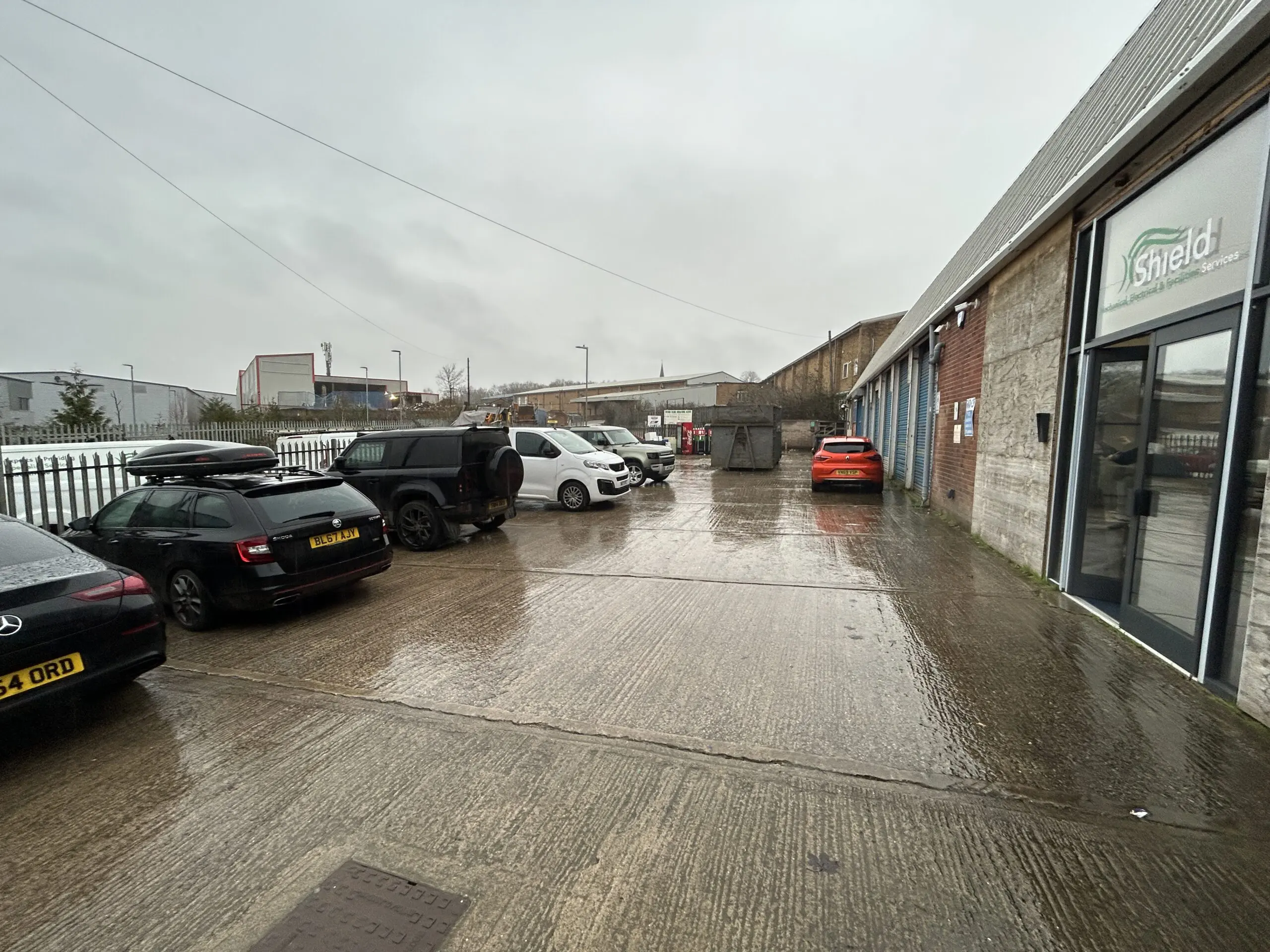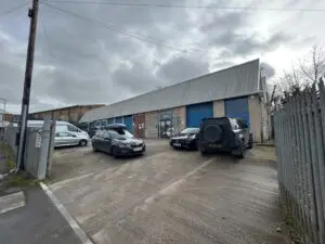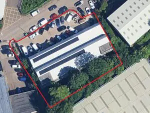 A detached steel framed warehouse/office unit of brick construction with a new metal sheet profile clad roof incorporating PV panels and a large secure yard.
